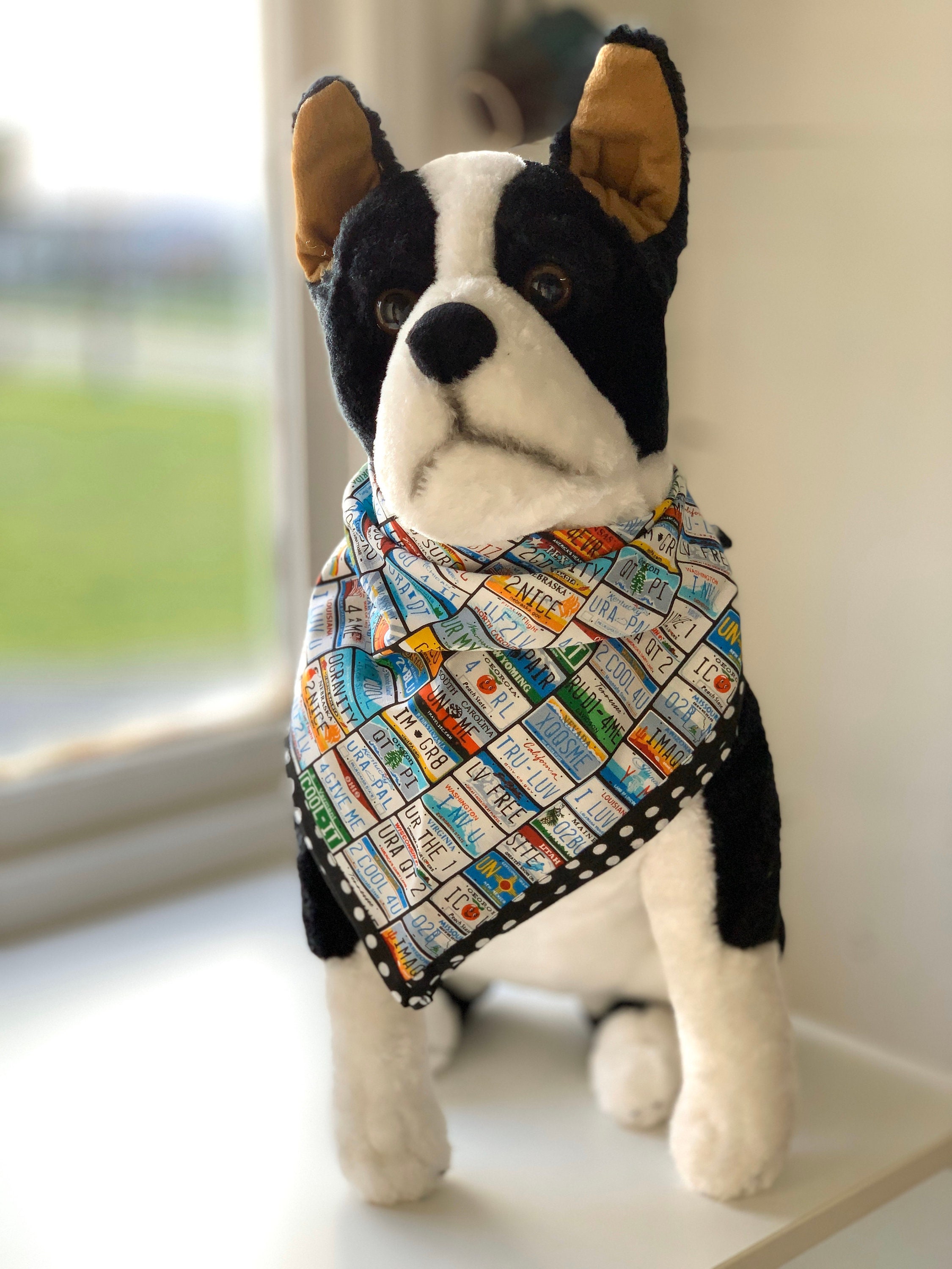 Are you looking for that perfect gift for you pet? I was too, and I couldn't find the quality that would go the distance. As an owner of a large breed dog, who drools ALOT, I wanted something that would stand the test of time, and look good too. I ordered a dog bandana online, and I could see that the surged edge just wasn't going to do it for me or for Hubert. I had just paid 20 dollars for a piece of cotton fabric with a surged edge.