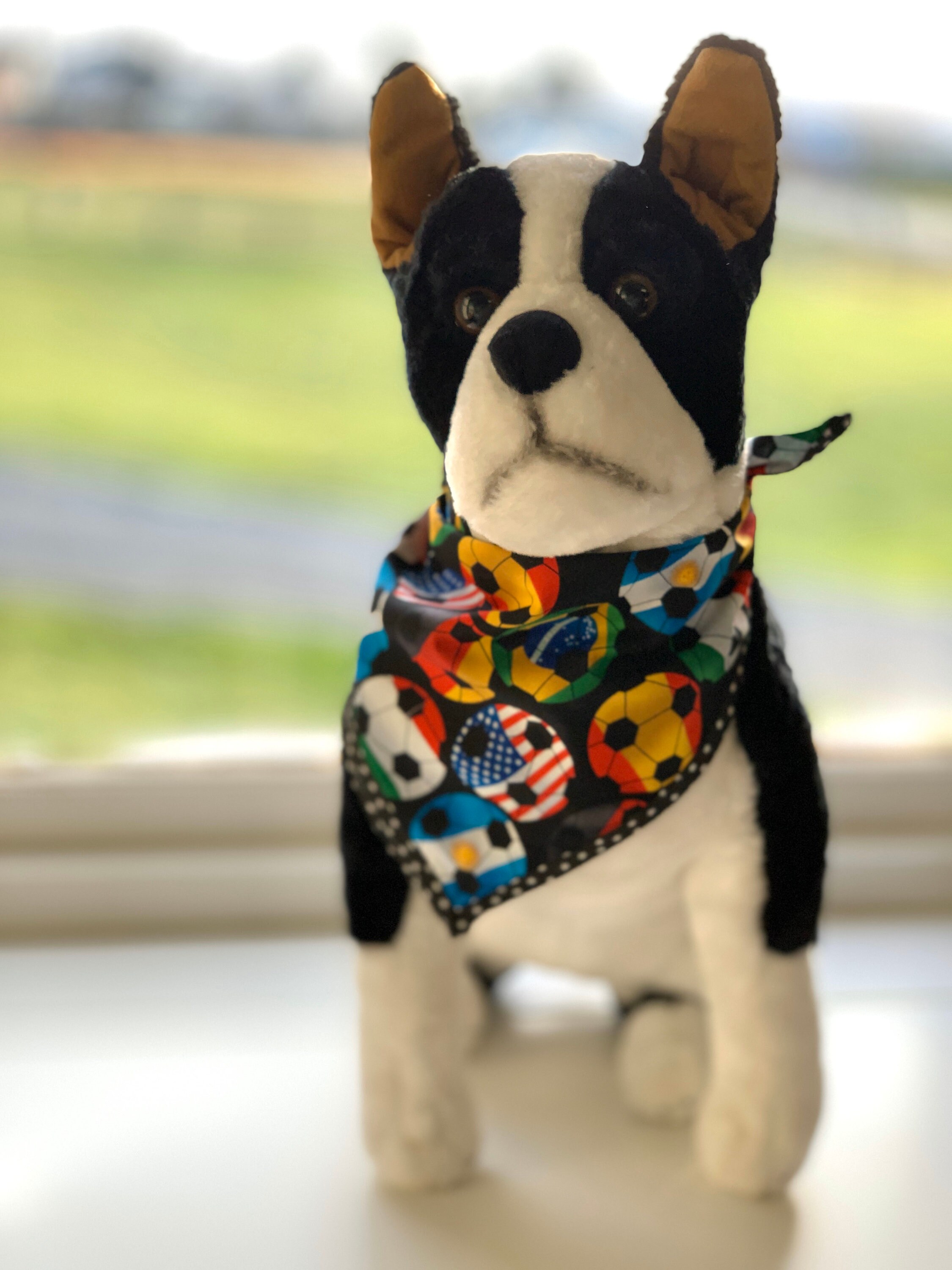 This bandana was made in two sizes. Classic and Jumbo. See the images to know which size will be best for your furry friend. The furry friend modeling this bandana in the classic size, stands approximately 20 inches tall and has a neck measurement of 14.5 inches.