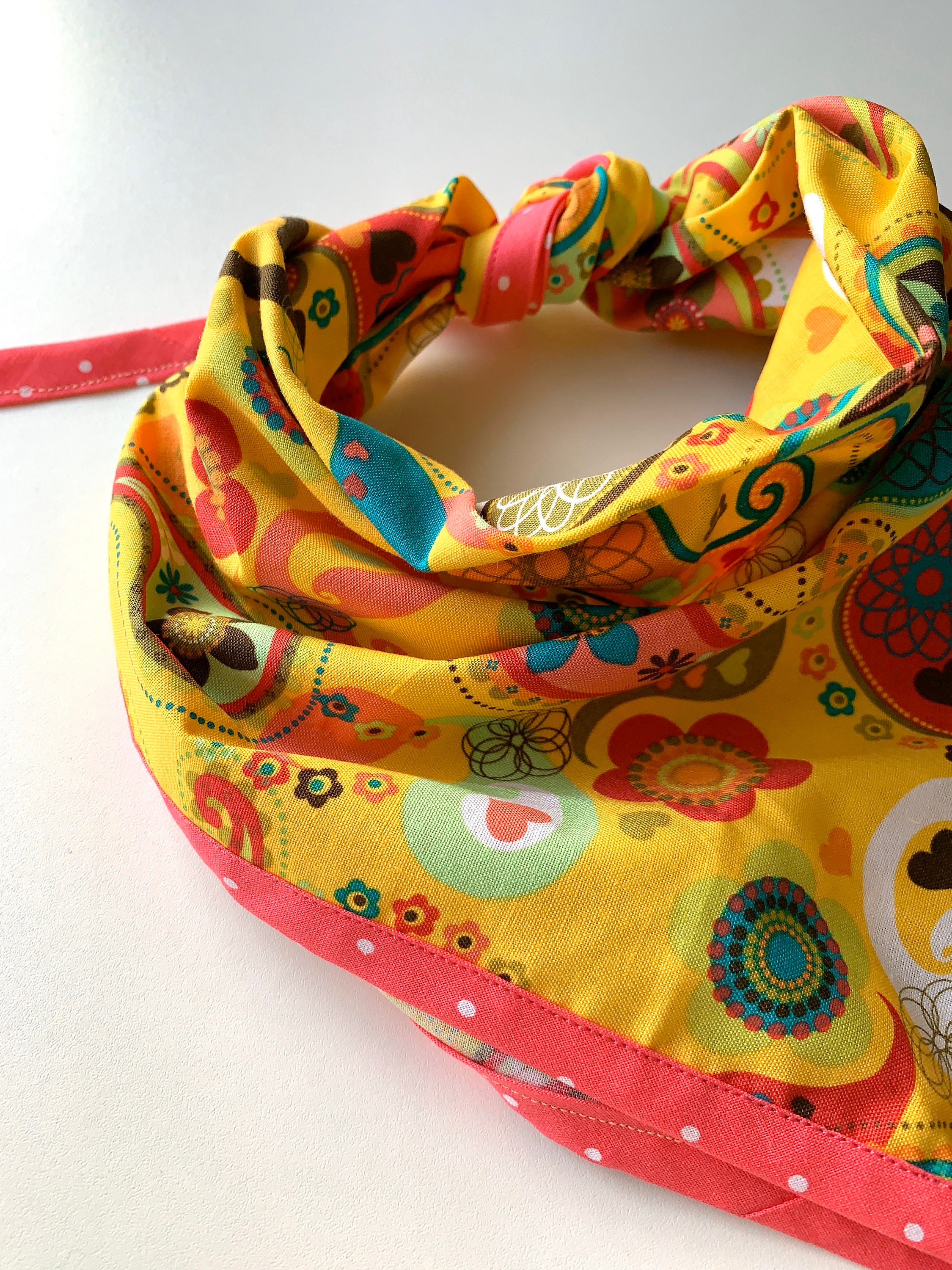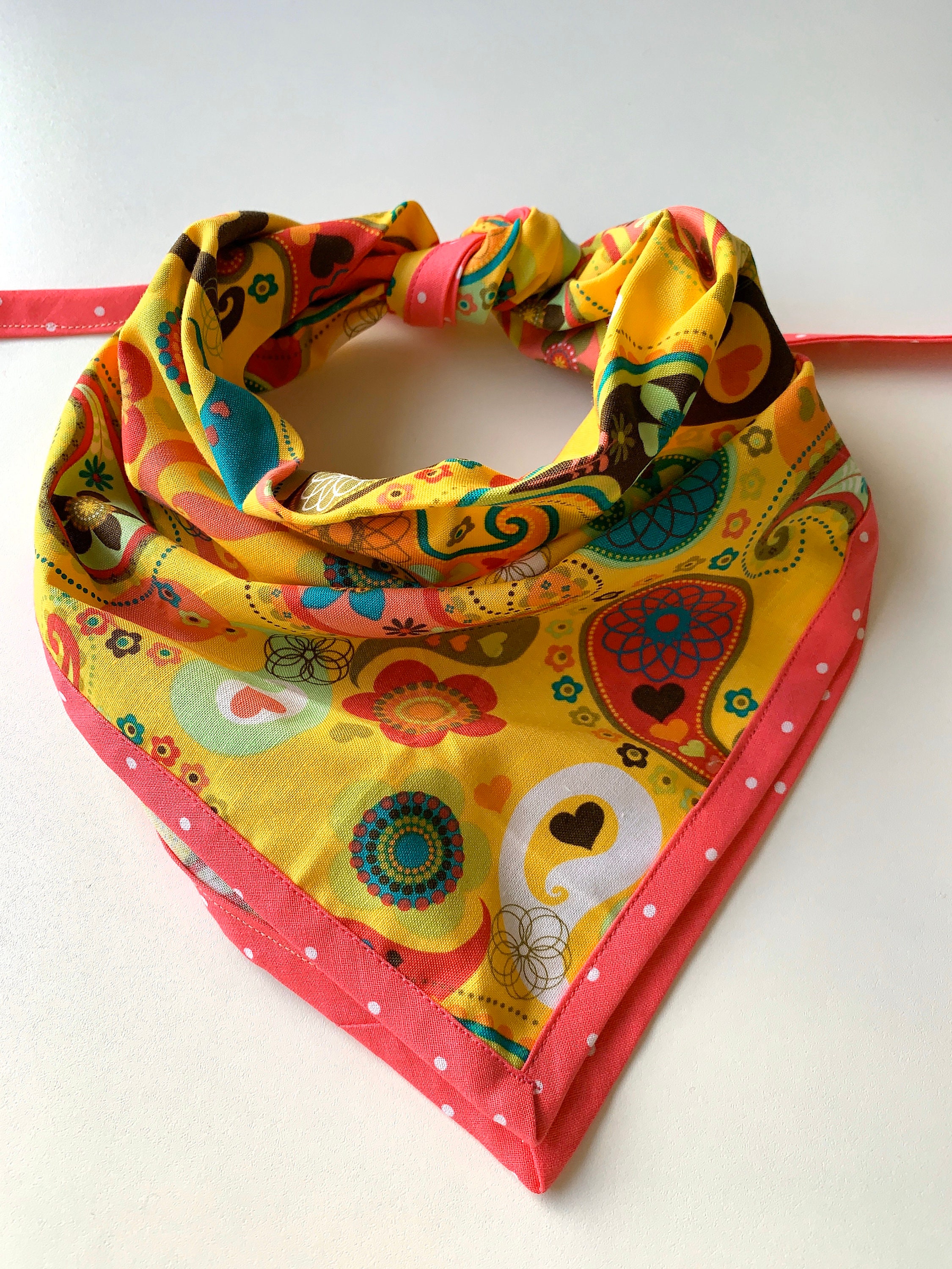 I am happy to say that I have figured out a way to make a dog bandana for your pet that will last. Each bandana is hand cut and the bias tape that is sewn around the edge is hand made by me! I put a ton of love and care into each of these unique cotton bandanas.